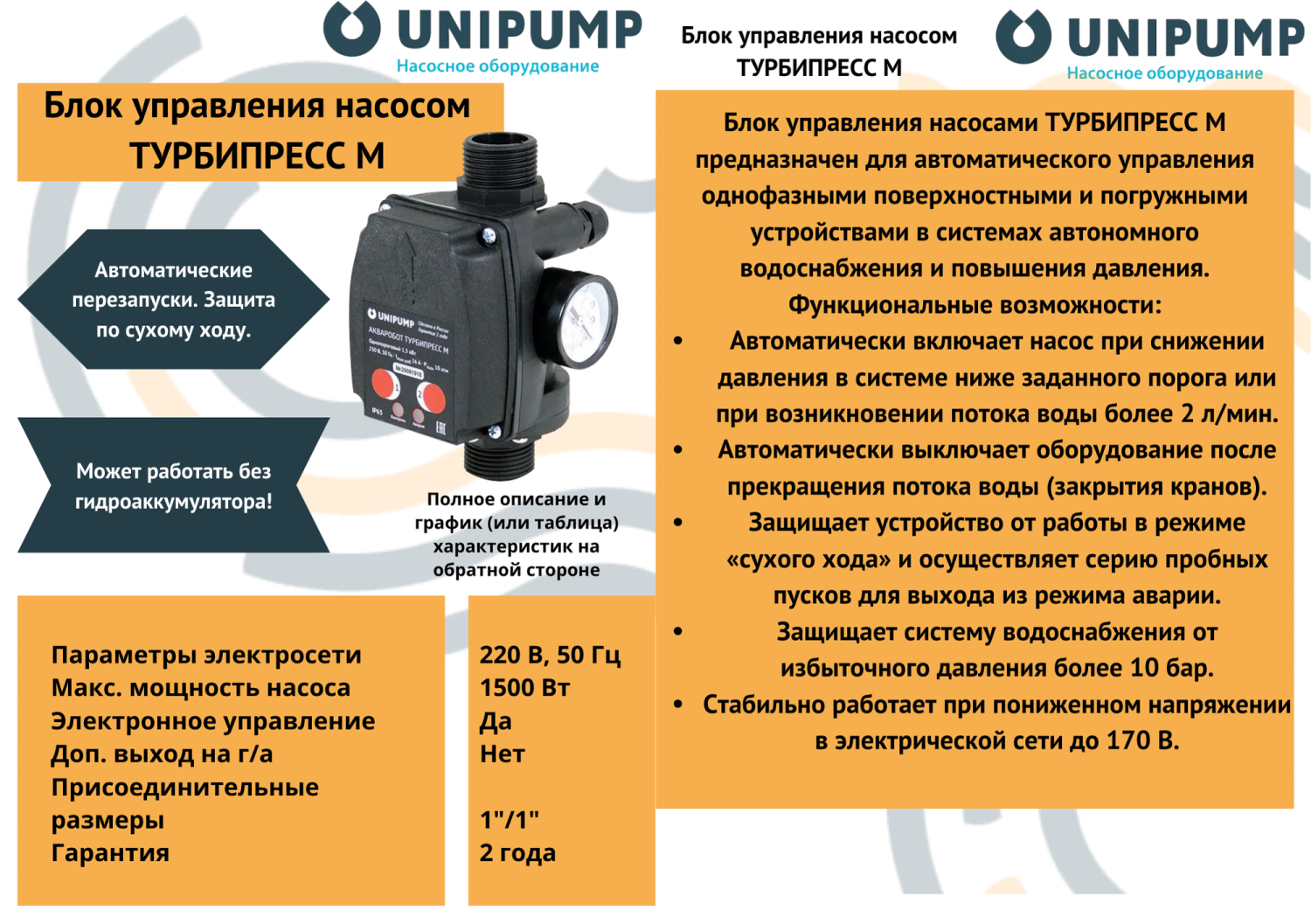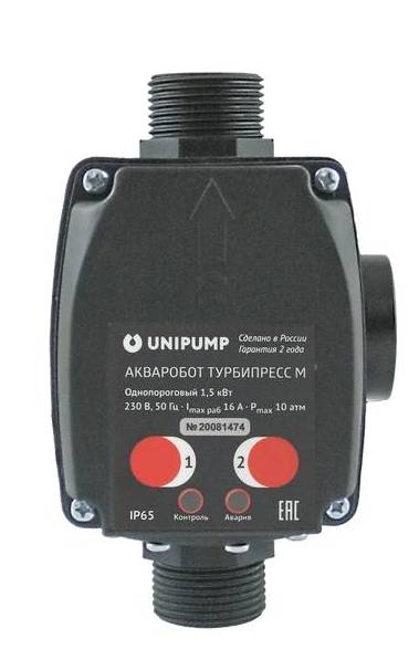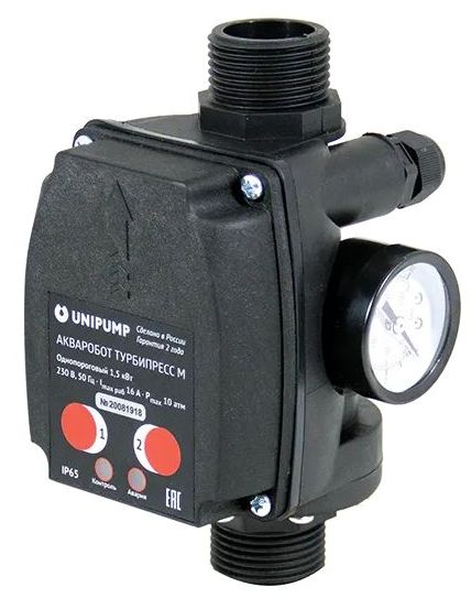 Блок управления насосами ТУРБИПРЕСС М предназначен для автоматического управления однофазными поверхностными и погружными устройствами в системах автономного водоснабжения и повышения давления.Максимальная мощность насоса - 1.5кВт.