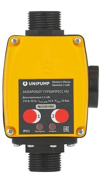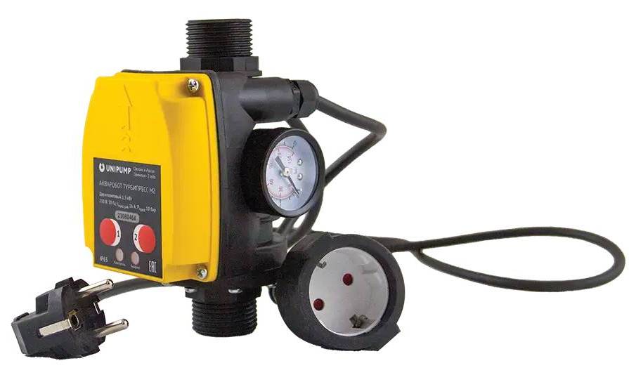 Блок автоматического управления насосом АКВАРОБОТ ТУРБИПРЕСС М2 предназначен для автоматического управления однофазными насосами мощностью до 1,5 кВт по потоку жидкости и по давлению в системе.