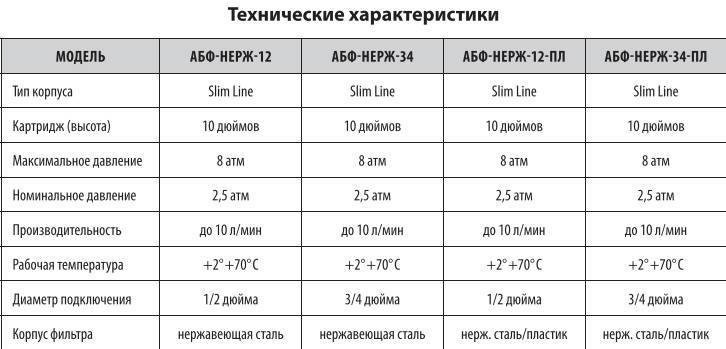 Для установки в фильтр серии АБФ-НЕРЖ, предназначены картриджи стандарта Slim Line 10". В зависимости от назначения рекомендуется использовать следующие виды картриджей: