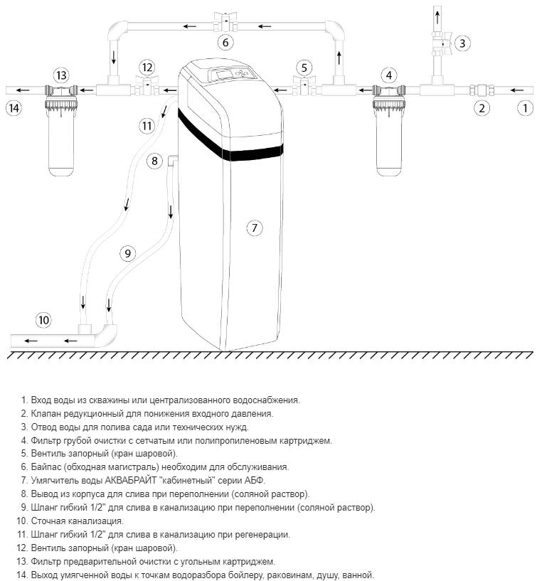 Умягчитель воды АКВАБРАЙТ устанавливается сразу после ввода воды в дом. При наличии в доме котла, бойлера или других нагревателей воды необходимо, чтобы умягчитель был установлен перед ними.