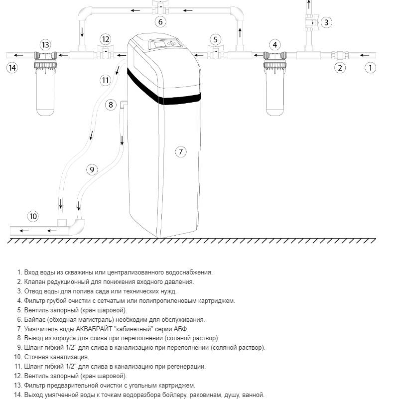 Умягчитель воды АКВАБРАЙТ устанавливается сразу после ввода воды в дом. При наличии в доме котла, бойлера или других нагревателей воды позаботьтесь о том, чтобы умягчитель был установлен перед ними.
