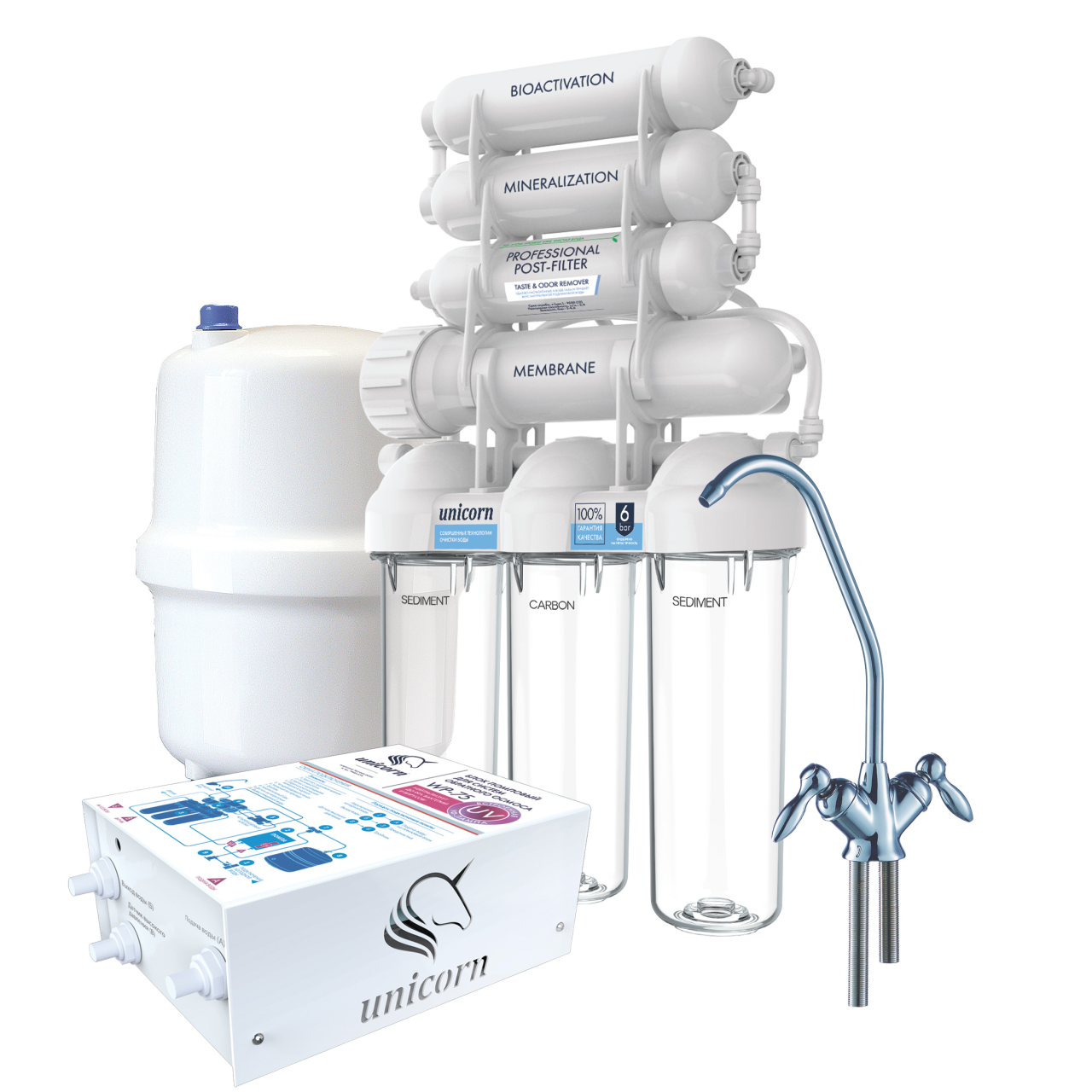 Оснащена помповым блоком повышения давления для подключения к сети переменного тока напряжением 220 В. Блок используется для повышения давления воды и обеспечения бесперебойной работы системы. Встроенная УФ лампа нейтрализует до 99% бактерий и вирусов.