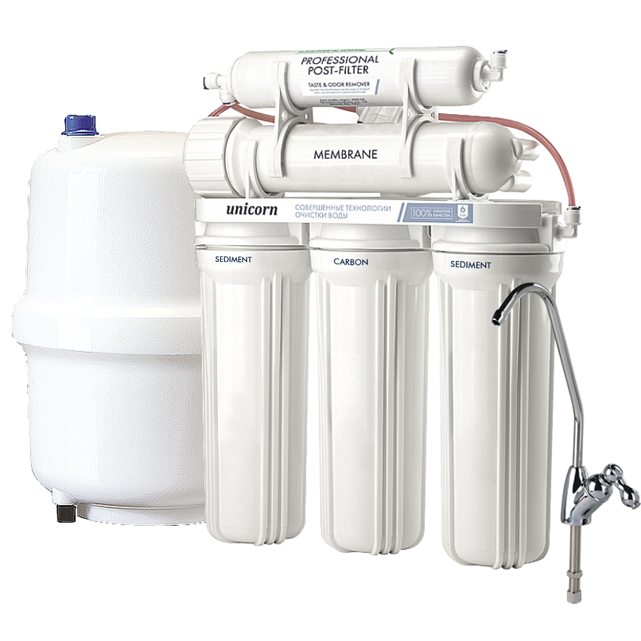 Система очистки для получения воды наивысшего качества. Несколько ступеней очистки, включая обратноосмотическую мембрану, позволяют удалить до 99% всех видов загрязнений, включая бактерии и вирусы. Очищенная вода накапливается в отдельном баке и подается через кран, отдельно устанавливаемый на кухонной мойке.