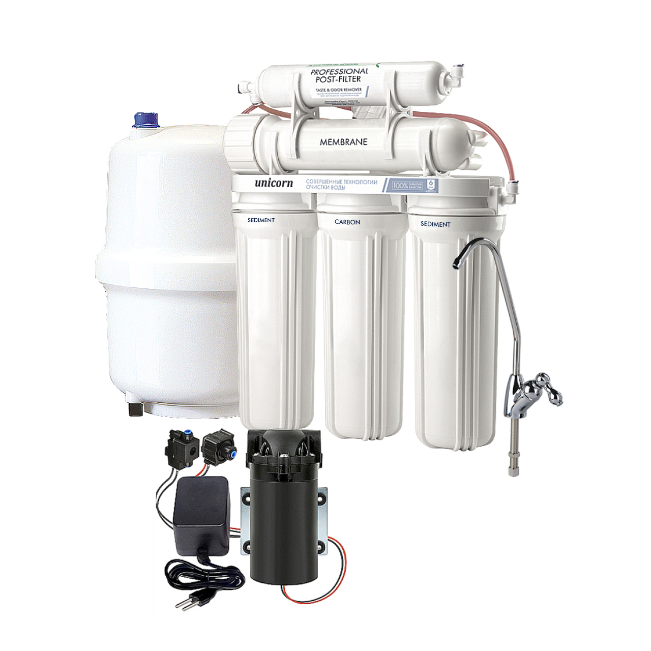 Система очистки для получения воды наивысшего качества. Несколько ступеней очистки, включая обратноосмотическую мембрану, позволяют удалить до 99% всех видов загрязнений, включая бактерии и вирусы. Очищенная вода накапливается в отдельном баке и подается через кран, отдельно устанавливаемый на кухонной мойке.