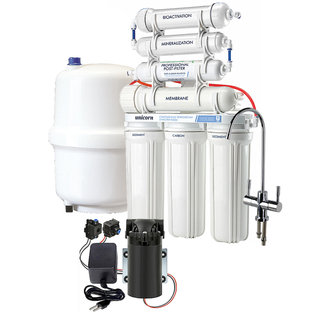 Система очистки для получения воды наивысшего качества. Несколько ступеней очистки, включая обратноосмотическую мембрану, позволяют удалить до 99% всех видов загрязнений, включая бактерии и вирусы. Очищенная вода накапливается в отдельном баке и подается через кран, отдельно устанавливаемый на кухонной мойке.