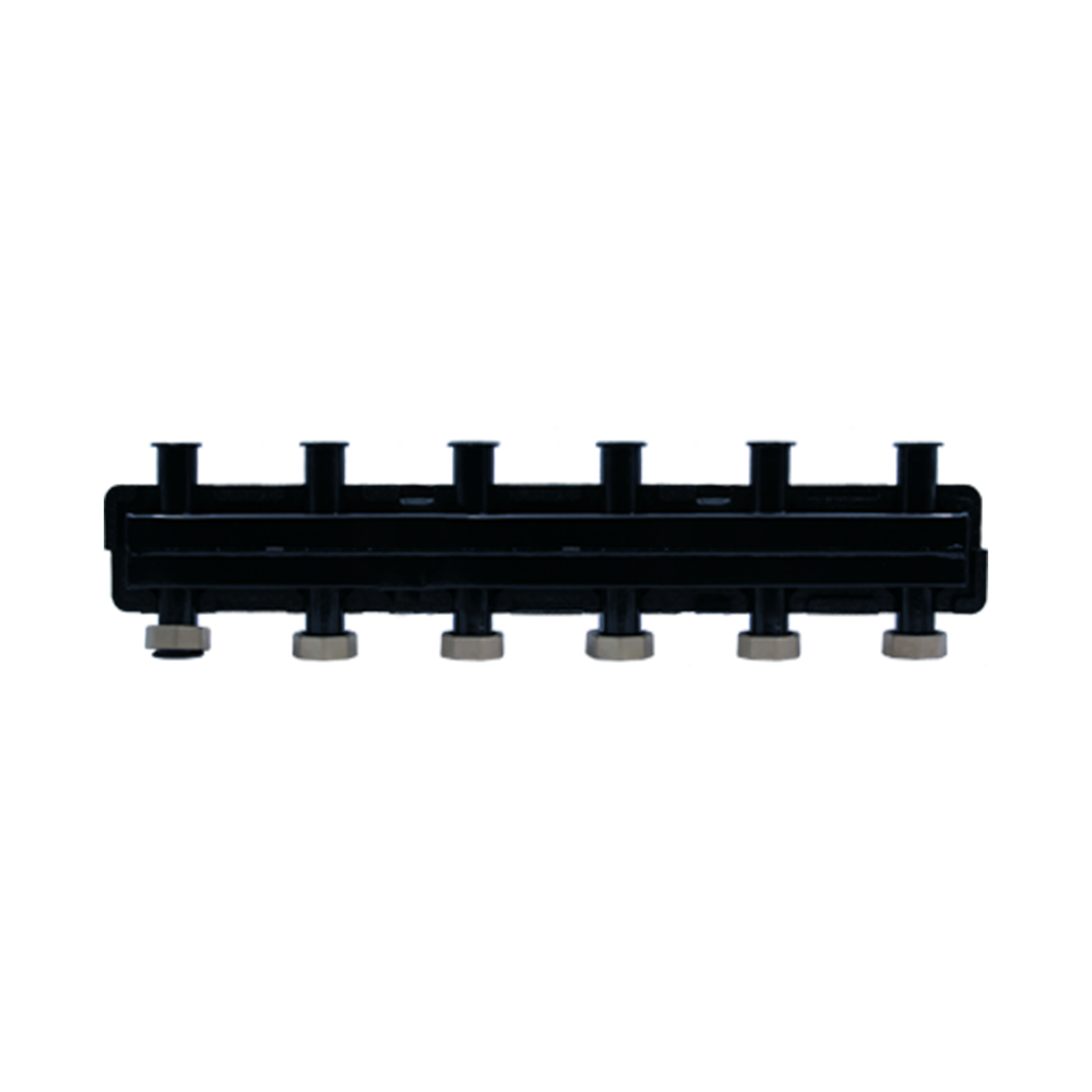 Корпус коллектора монтируется к контуру котла отопления или гидрострелке через накидные переходники, далее при помощи накидных гаек происходит подключение контуров потребителей теплоносителя. Герметизация соединений обеспечивается уплотнительными прокладками.