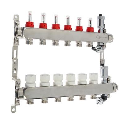 Коллекторная группа из нержавеющей стали на 5 выходов поставляется в сборе с расходомерами, автоматическими воздухоотводчиками и дренажными клапанами. Коллекторные блоки могут работать как на водяном, так и на низкозамерзающем (гликолевом) теплоносителе.
