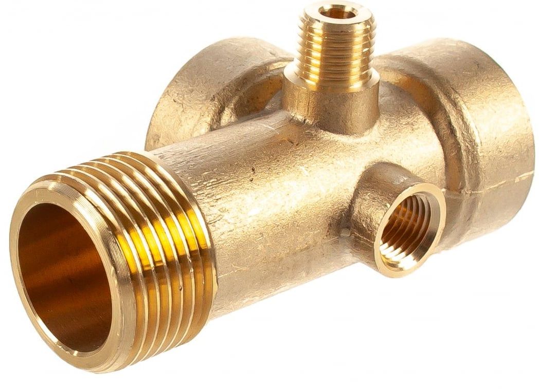 Пятивыводной латунный штуцер — применяется в автономных системах автоматического водоснабжения для соединения гидроаккумулятора, насоса, реле давления и манометра.