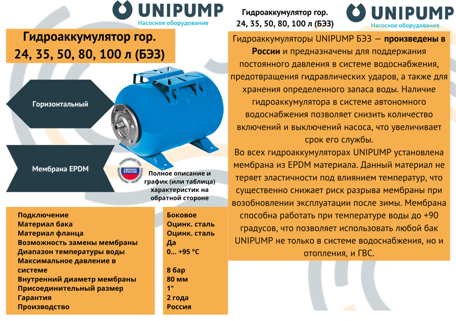 Гидроаккумулятор UNIPUMP предназначен для поддержания и плавного изменения давления жидкости в системе водоснабжения, он обеспечивает защиту системы от гидроударов, ограничивает количество включений насоса, при отключении электроэнергии накапливает и выдает под давлением некоторый запас воды. Горизонтальный гидроаккумулятор оснащен усиленной площадкой для установки насоса. При использовании совместно с реле давления, позволяет создать автоматическую станцию на базе погружного или поверхностного насоса. Данная модель гидроаккумулятора производится на АО «БЭЗ» в России.