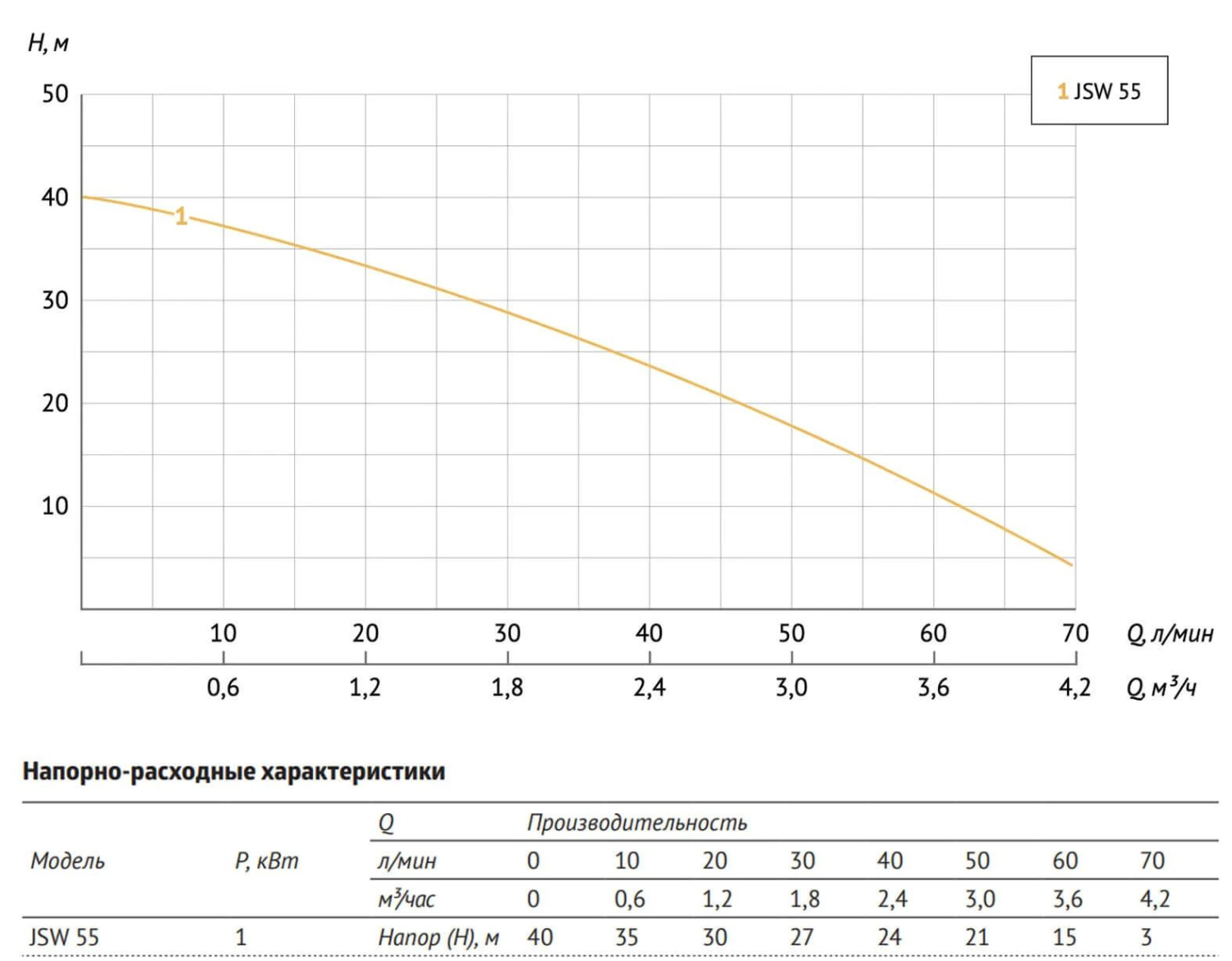 Отличительными особенностями серии JSW являются честные, а не завышенные характеристики. Использование медной обмотки двигателя позволяет достигать указанных характеристик при гораздо меньших энергозатратах. За счет использования латунных рабочих колес, достигается более продолжительный период работы без снижения указанных характеристик. Модель оснащена удлиненным встроенным эжектором, что позволяет получить более высокую и стабильную напорно-расходную характеристику работы на критической глубине всасывания до 8 метров.