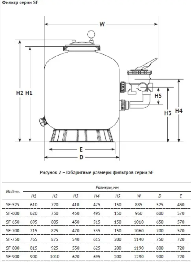 Песочный фильтр предназначен для механической очистки воды от примесей органического и неорганического происхождения путем прохождения воды через слой кварцевого песка, засыпаемого в фильтр. Основным элементом конструкции фильтра является многофункциональный 6-позиционный клапан, с помощью которого обеспечивается управление различными режимами работы фильтра. Расположение 6-позиционного клапана определяет тип подключения фильтра — верхнее или боковое.
