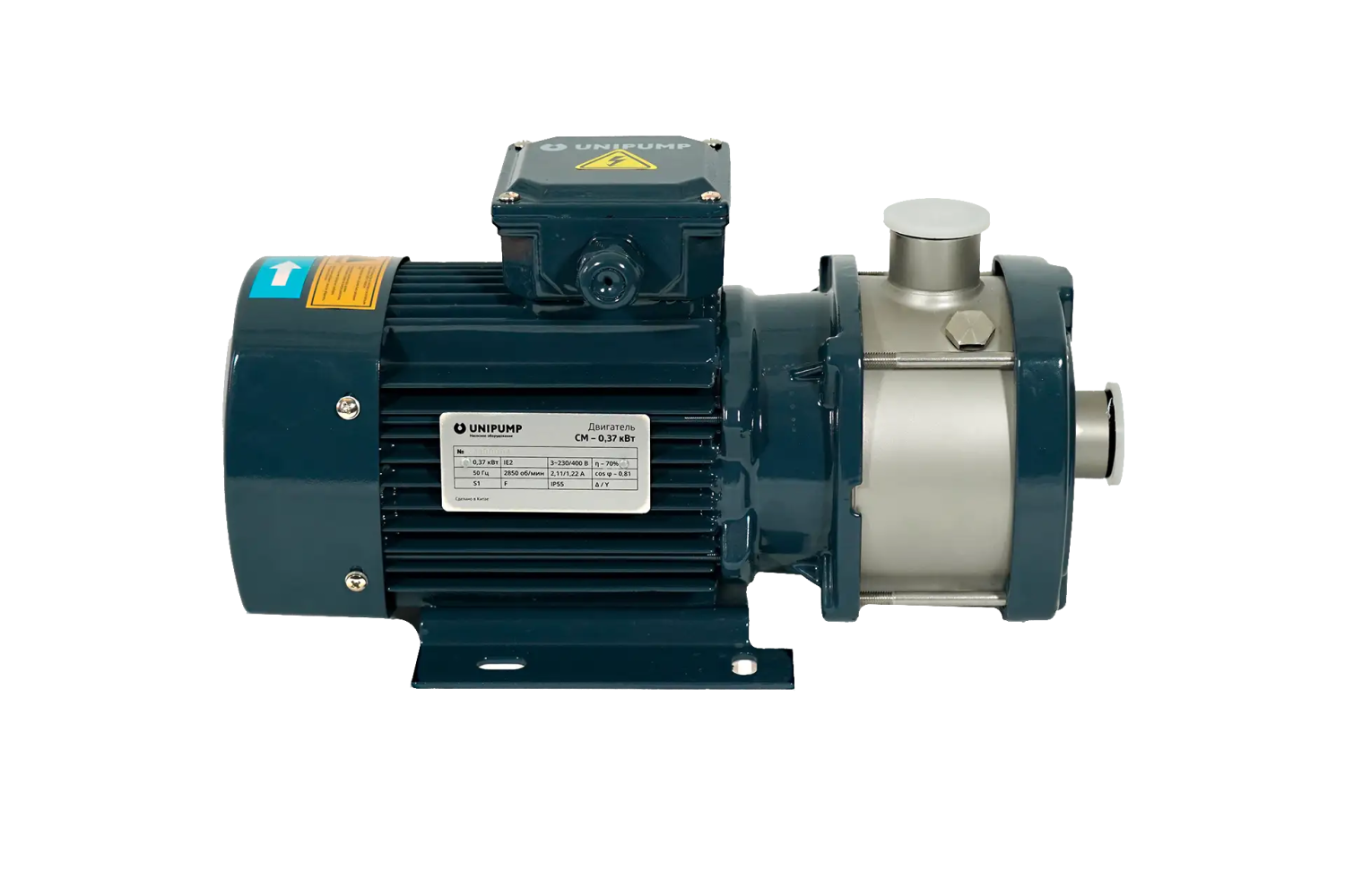 Насосы центробежные горизонтальные многоступенчатые серии CM представляют собой устройства с горизонтальным типом установки и многоступенчатой проточной частью, предназначенные для перекачивания чистой воды и других неагрессивных к материалам насоса жидкостей, сходных по свойствам с водой, и не содержащих твердых и волокнистых включений в различных инженерных системах и промышленных установках. Насосы способны обеспечивать высокий напор за счет последовательного расположения рабочих колес (ступеней) на одном валу. Конструкция насоса позволяет осуществлять подключение к трубопроводам с использованием резьбового осевого всасывающего патрубка и радиального напорного патрубка.