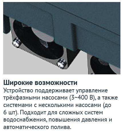 Обеспечивает защиту насоса от отсутствия воды, перегрузки по току, блокировки рабочего колеса, а также от скачков или падений напряжения. Автоматически осуществляет серию пробных пусков.