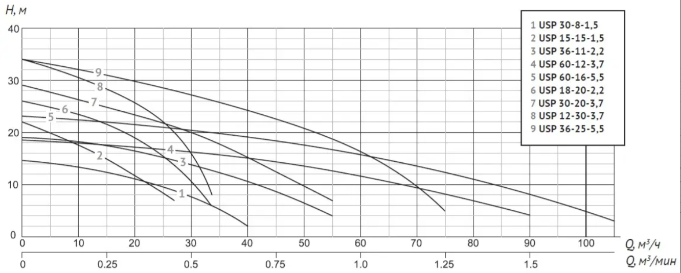 Электродвигатель состоит из корпуса, статора с медной обмоткой, ротора, вал которого изготовлен из нержавеющей стали. Насосы серии USP и USPA оснащаются асинхронным 2-полюсным двигателем, имеют встроенную термозащиту (кроме модели USP 60-35-11), и комплектуются кабелем питания. Термозащита сработает при перегреве двигателя, после охлаждения он автоматически запустится. Все насосы оборудованы герметичным кабельным вводом, обеспечивающим надежную защиту от проникновения жидкости в двигатель.
