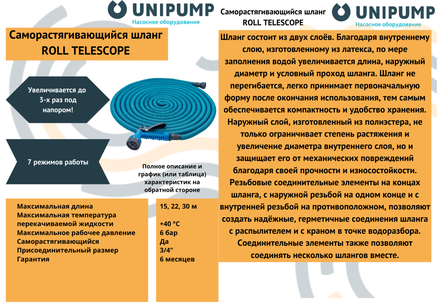 Шланг состоит из двух слоёв. Благодаря внутреннему слою, изготовленному из латекса, по мере заполнения водой увеличивается длина, наружный диаметр и условный проход шланга. Шланг не перегибается, легко принимает первоначальную форму после окончания использования, тем самым обеспечивается компактность и удобство хранения.