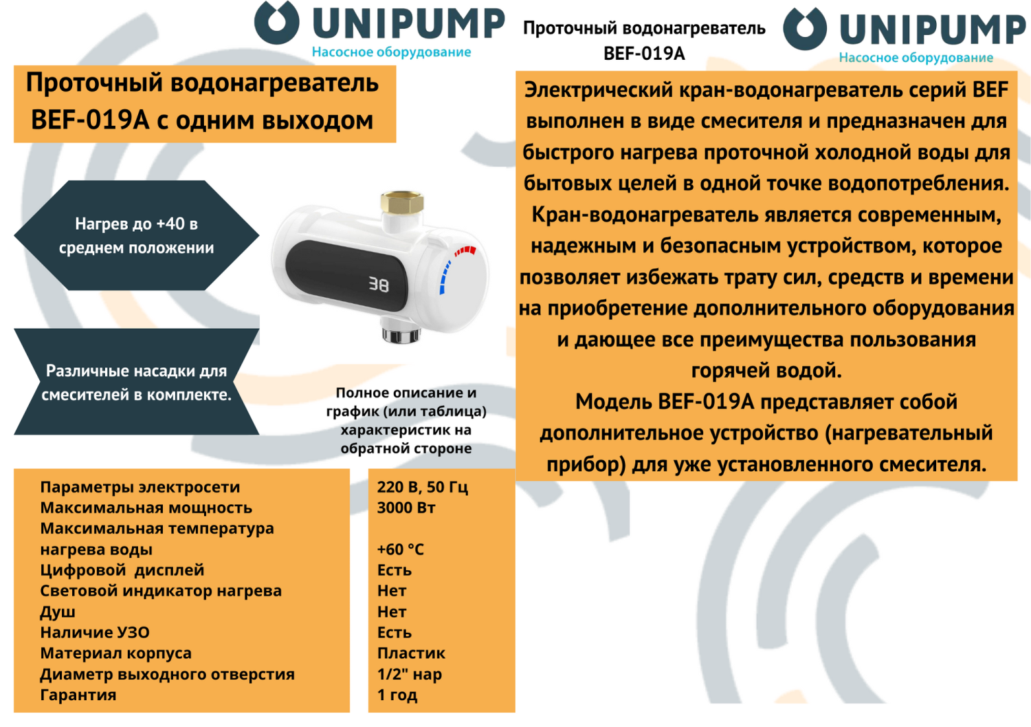 Модель BEF-019A с одним выходом представляет собой проточный водонагреватель для уже установленного смесителя. Съёмная, место установки и эксплуатации может меняться.