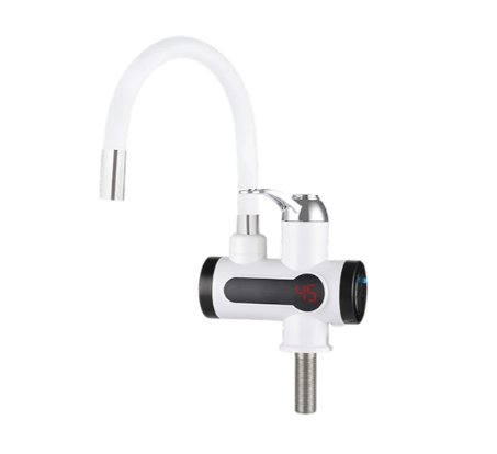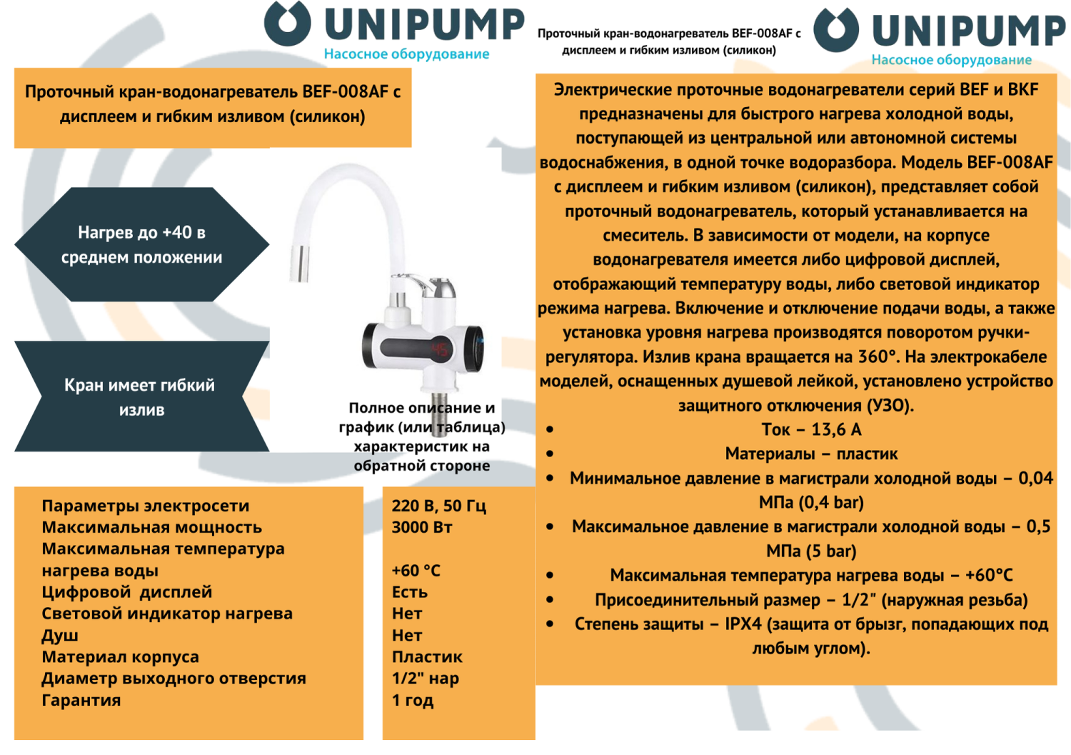 Модель UNIPUMP BEF-008AF с дисплеем и гибким изливом из силикона. Этот проточный водонагреватель устанавливается на смеситель и оснащен регулятором температуры и подачи воды, который управляется поворотом ручки. На корпусе водонагревателя имеется цифровой дисплей или световой индикатор режима нагрева для удобства контроля температуры. Излив крана может вращаться на 360°, обеспечивая легкое направление потока воды.