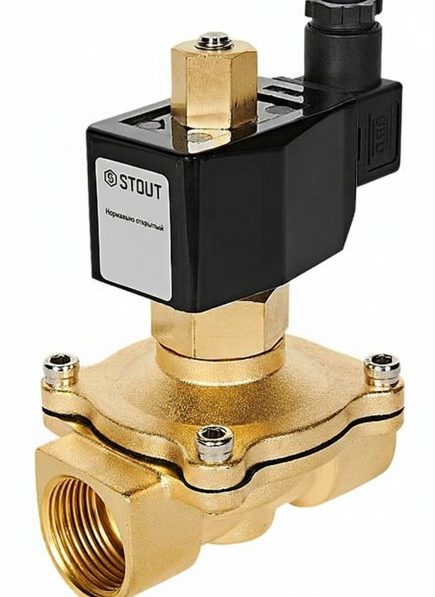 Клапан двухпозиционный электромагнитный (Соленоид) прямого действия STOUT нормально открытый (НО), предназначен для автоматического управления потоками среды, не агрессивной к материалам клапана (воды, масла, нейтральных газов и т. д.).